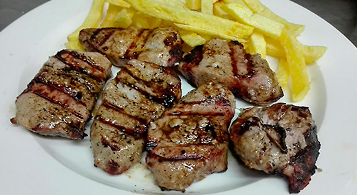Here, there are a lot of different dishes, the most popular are: baked potatoes stuffed with cheese, grilled iberian sirloin with green sauce and «flamenquin», people who try flamenquin think it´s fantastic.