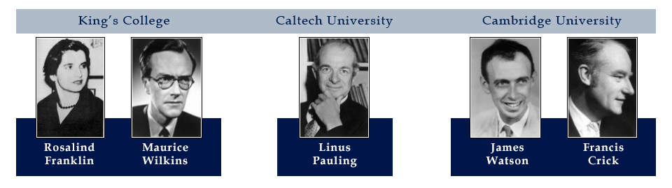 Paralelamente, una pareja de científicos de la Universidad de Cambridge trabajaban en el mismo tema. Sus componentes eran Francis Crick (1916-2004) físico, y James Watson (1928) biólogo estadounidense.
