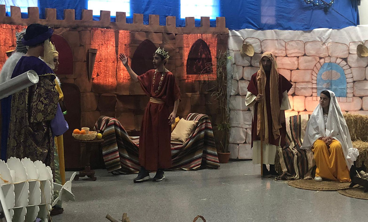 A finales del primer trimestre, en los días previos a las vacaciones de Navidad, los alumnos de 3º y 4º empezamos a ensayar “El auto de los Reyes Magos”. Lo habíamos leído y trabajado en clase de literatura medieval con José Antonio y Rocío. También lo habíamos dramatizado. Y le propusimos al profesor la representación. Como no daba tiempo antes de Navidad que era lo que pegaba, y como sabíamos que nos visitaría el señor obispo en visita pastoral el 31 de enero, pensamos que sería un buen momento. La dirección y adaptación fue llevada a cabo por José Antonio, nuestro profesor de Lengua, que, por cierto, la cambió un chorro de veces.