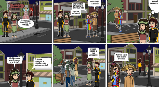 STORYBOARD GUIÓN LITERARIO En la ciudad, tiene lugar esta misma noche una fiesta de disfraces. Todos hablan de esta famosa fiesta, así que Jose y su novia María deciden ir…