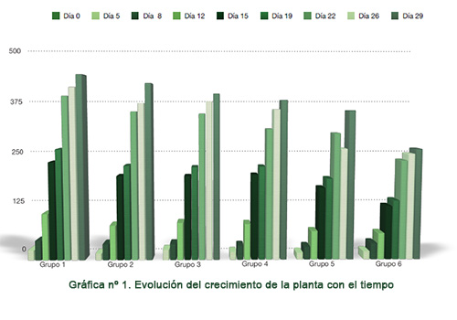 Los resultados de crecimiento se muestran en la Gráfica nº 1, y se observa que en cada grupo el crecimiento aumenta conforme pasan los días, incluso en los dos últimos grupos, que presentan mayor contenido de sal.