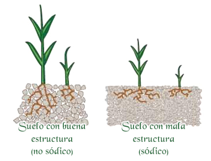 El exceso de iones de sodio desplaza el calcio y el magnesio y provoca la dispersión y desegregación del suelo. El suelo se vuelve duro y compacto en condiciones secas y reduce la infiltración del agua y del aire a través de que conforman el suelo.