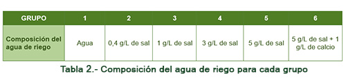 Cada grupo se regará con 10 de una disolución que presenta una cantidad distinta de sal, desde 0 g/L a 5 g/L, y en el último grupo se añadirá 0,2 g/L de calcio para evaluar el efecto del calcio en la inhibición del sodio. En la tabla nº1 se muestra la composición del sustrato y en la Tabla nº2 la de cada uno de los grupos.