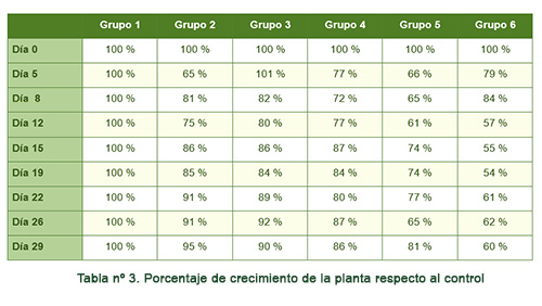 Según los resultados obtenidos tras un periodo de 29 días y nueve riegos de agua con distinta cantidad de sal (en función del grupo), se observa que la sal afecta al desarrollo de la planta, presentando variaciones desde un 5% (grupo 1) a un 20 % (grupo 5).