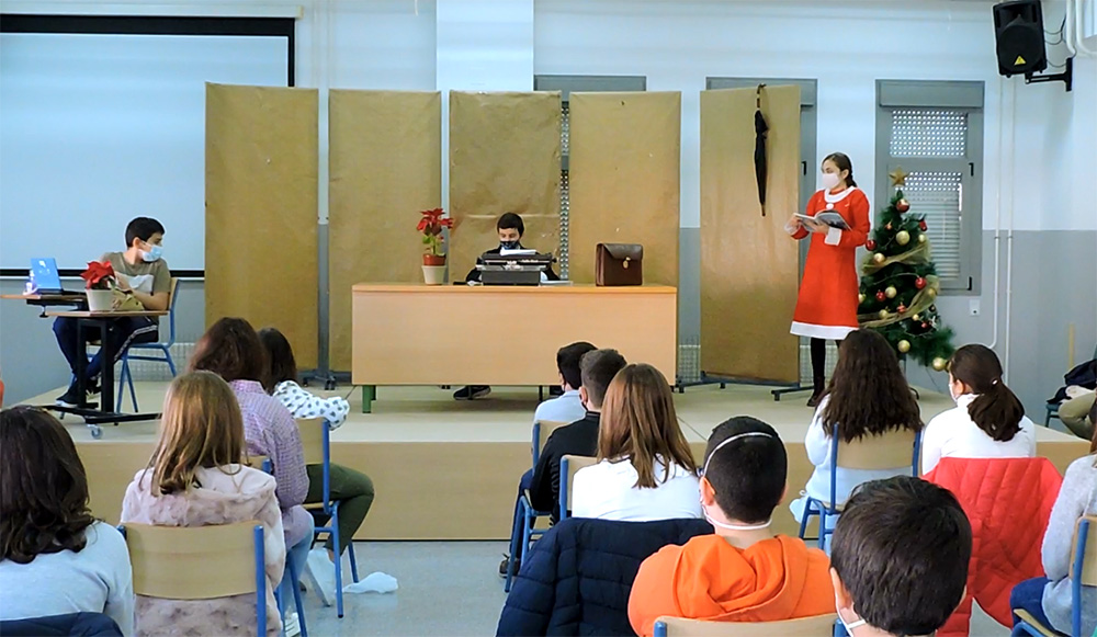 El director de la obra, es decir, el maestro de lengua, pidió a la alumna que le habló sobre el vídeo-cuento, ser la encargada del guión y los ensayos, como decía él, su mano derecha. Y así fue, estuvieron todo el fin de semana trabajando, ampliando el guión del año pasado, preparando las escenas, la escenografía, aunque mínima, y el vestuario. El lunes 21, fue el primer día de ensayo de todos los alumnos que colaboraron, y, por fin, ¡Llegó el día! El martes 22 hicieron los últimos ensayos y después del recreo, interpretaron en el salón de actos (SUM), con poco público debido a la pandemia.