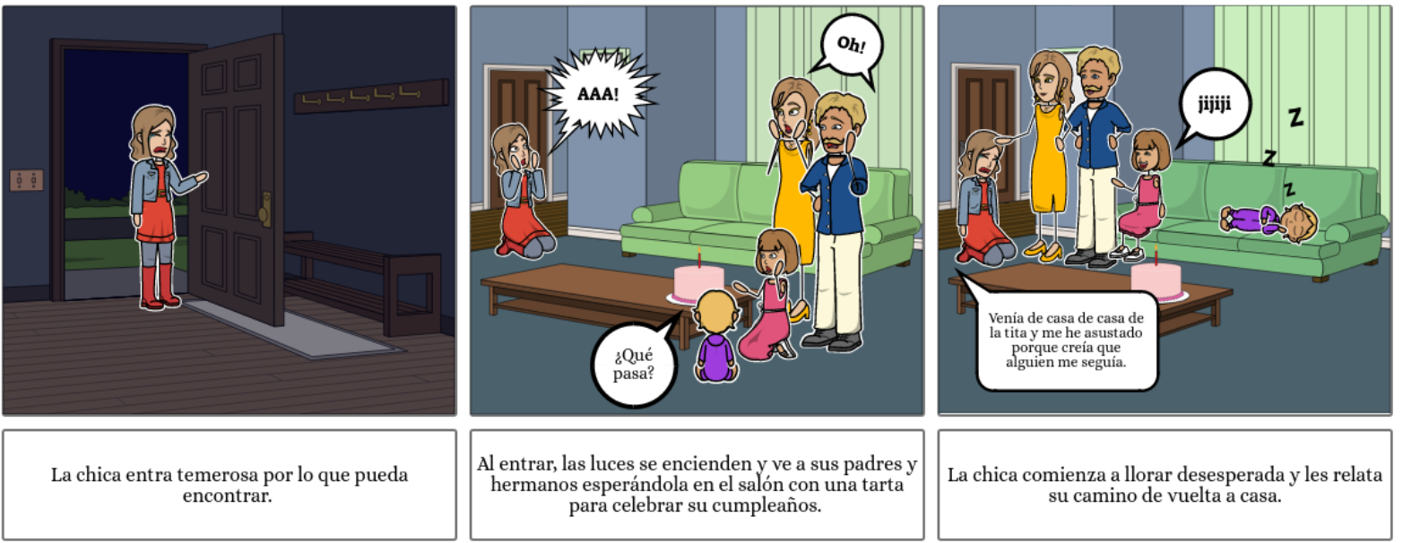 La chica entra temerosa por lo que pueda encontrar. Al entrar, las luces se encienden y puede ver a sus padres y hermanos esperándola en el salón con una tarta para celebrar su cumpleaños.